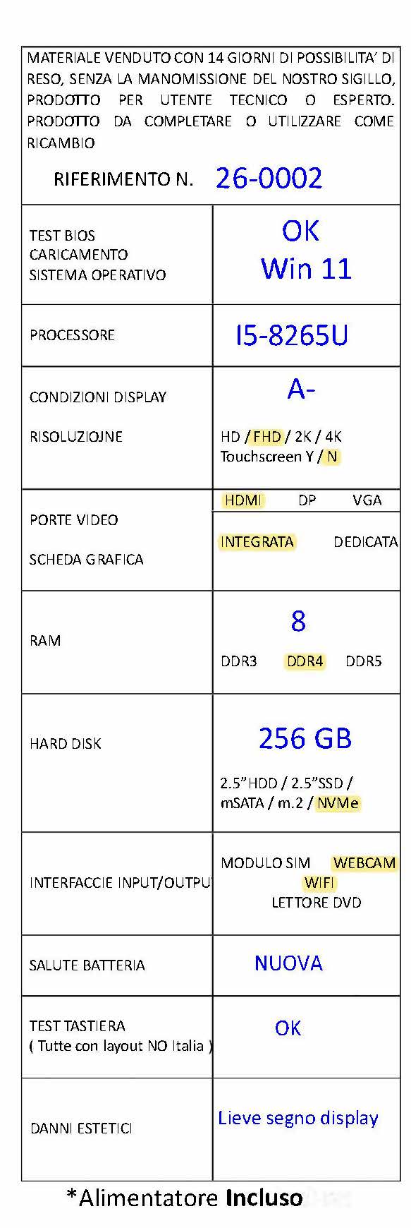 Garanzia: 12 Mesi windows 11 PRO già installato con software base già installati
