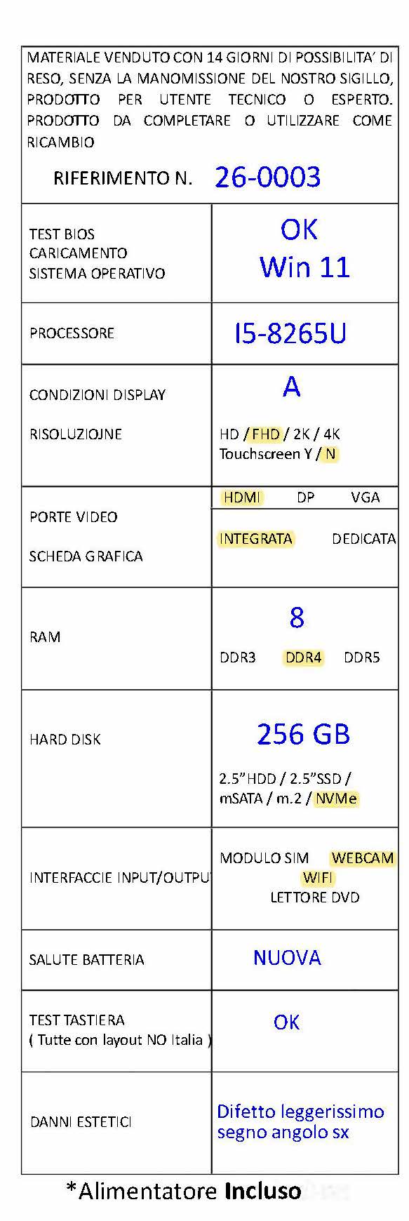 - processore Intel Core i5 (8va generazione) 8265u / 1.60 GHz